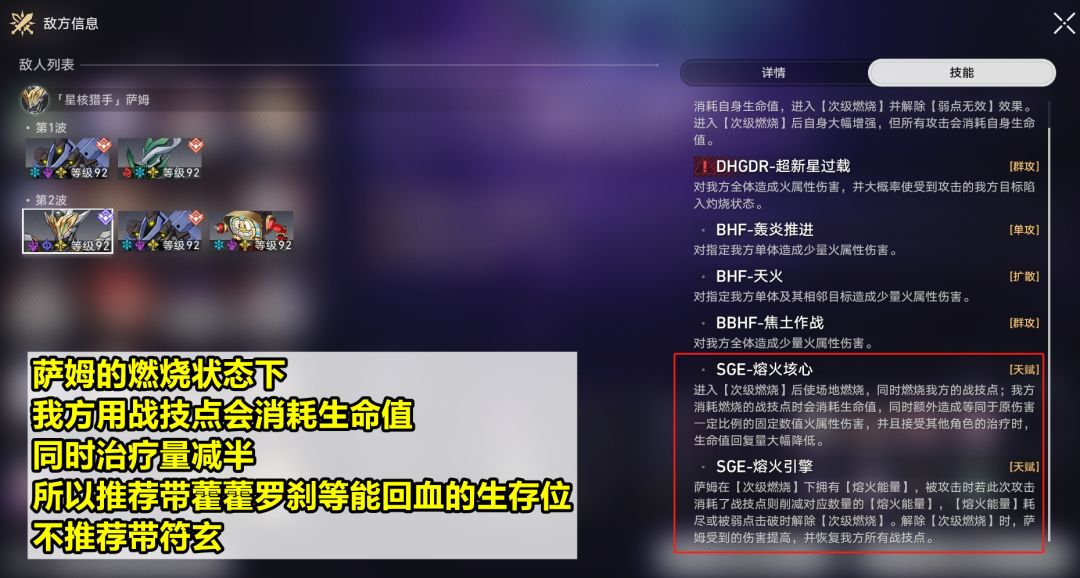 萨姆:最大的机制特色就是,转状态后燃烧我方的战技点。一旦用战技点就会受到伤害,并且这个状态下,治疗量也会减半;加上萨姆经常使用全体攻击,生存压力相当大。因此面对萨姆,一般都不推荐带符玄,更推荐优先带藿藿罗刹,再然后是其他能回血的生存位。