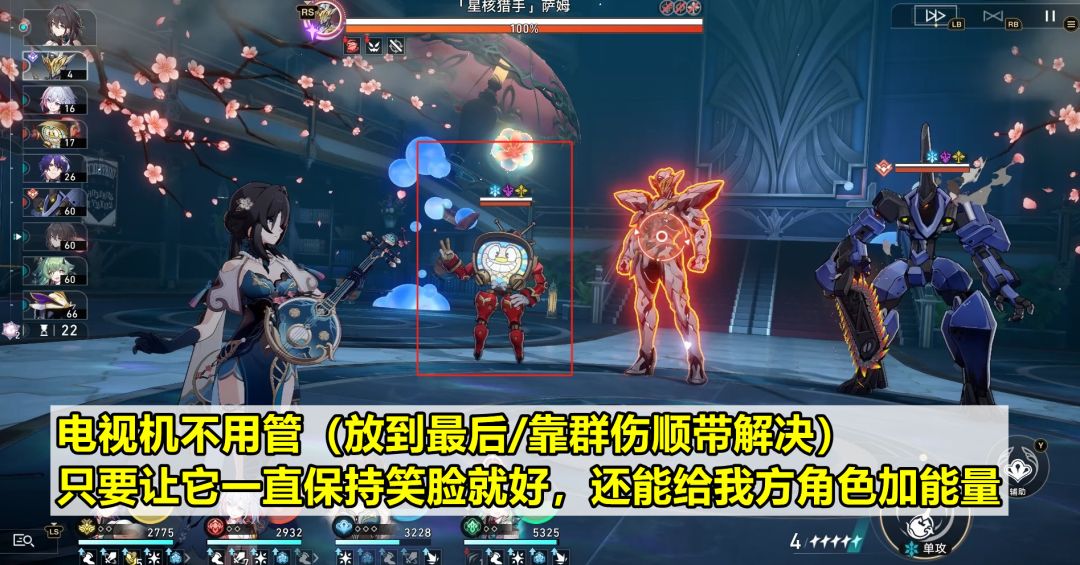 【关键敌人机制应对方式】惊梦剧团的圆幕先生:简称“电视机”。虽然是小怪,但实战中强烈推荐利用它笑脸状态下,给我方单体角色加不少能量的机制。不用急着解决电视机,靠辅助或生存位不用放技能时的普攻,或者输出角色顺带攻击到的群攻技能,让它保持笑脸即可。