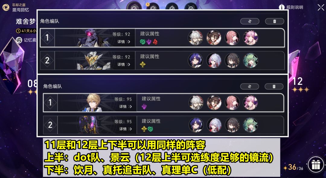 【配队推荐和总结】这期最好发挥的应该是三支配队:饮月队、dot队(卡黑)、追击队(真托);而且11层和12层可以用同样的上下半阵容。Dot队上下都能走,不过个人更推荐走上半,一方面是弱点匹配;另一方面是下半更适合饮月和真理。上半景元也是不错的选择。至于镜流,练度足够的话,12层上半也可以考虑用。