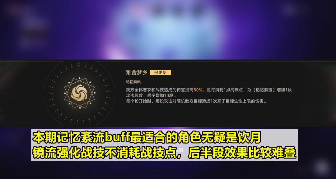 【记忆紊流】本期buff是普攻和战技增伤50%;并且每消耗一个战技点会叠层,每轮开始造成对应层数的伤害。因为是基于生命上限,所以这个伤害很可观,运用好的话可以省去一定轮数。单从前半段的增伤来看,饮月青雀镜流刃等角色都很适合;不过镜流强化战技不消耗战技点,以及面对萨姆还有高冰抗的杰帕德不好发挥,具体在后面的配队分析会提到。