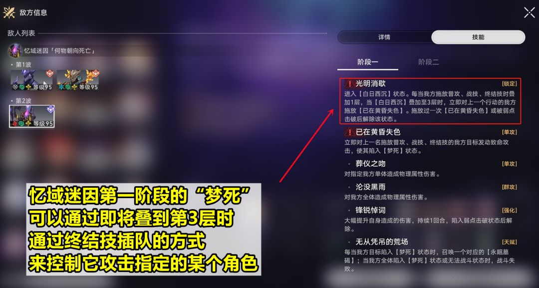 忆域迷因:最关键的“梦死”机制,我们可以通过终结技插队的方式控制它攻击哪个角色。第一阶段的“白日西沉”,普攻/战技/终结技都能给它叠层,叠到第3层就会攻击最近一个行动的我方角色。因此可以在叠到第2层后,马上放某个可以暂时不用的角色的终结技,让他承受“梦死”。