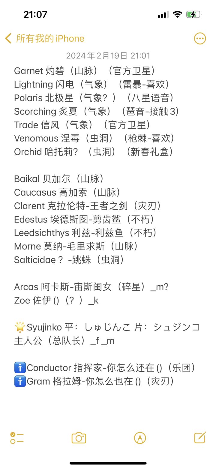 *总计文件数107,其中❶70个为已上线角色(全部能一一对应上);❷7个wiki上标为“未实装”的角色:阿瑞斯、坍陨、雅典娜、萨斯塔、茶晶、幻响、红雾;❸9个已露面的碎星角色:洛基、宙斯、托尔、丝卡蒂、布伦希尔德、赫拉、赫耳墨斯、格恩达尔、波塞冬;❹1个名为“Kadya”的文件,应该是卡蒂雅Katya;❺2个内测男性角色:指挥家、格拉姆;❻2个名为“syujinko”的文件,应为男女总队长cv(日文罗马音,我抠了好久