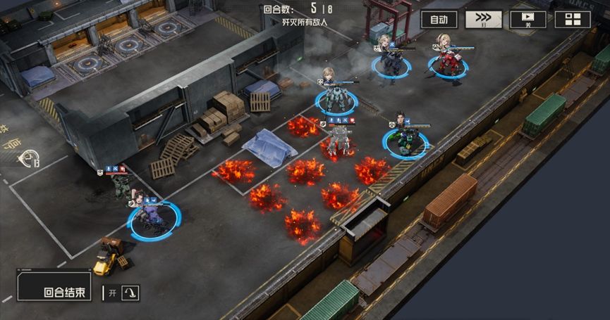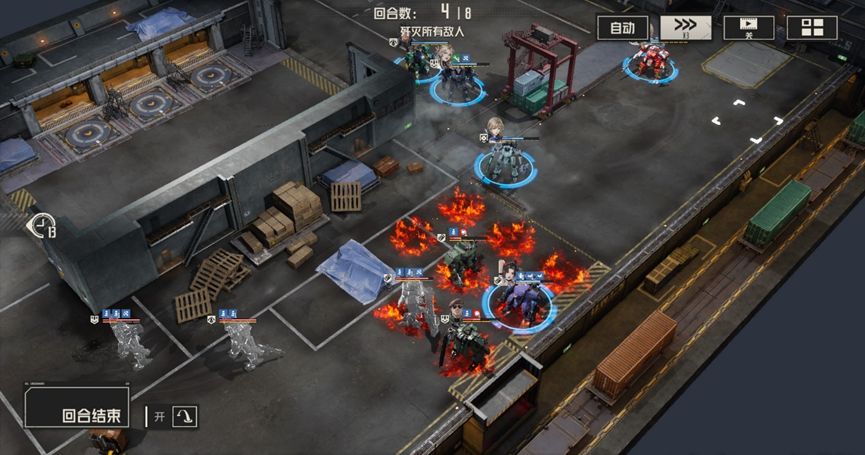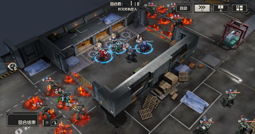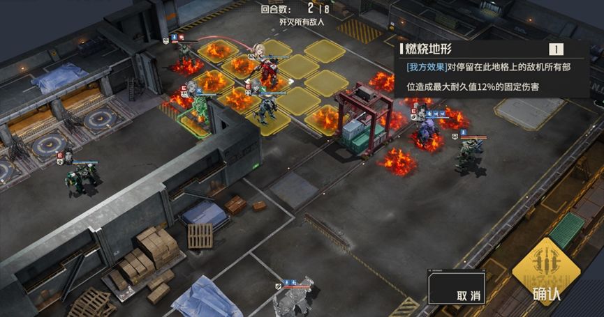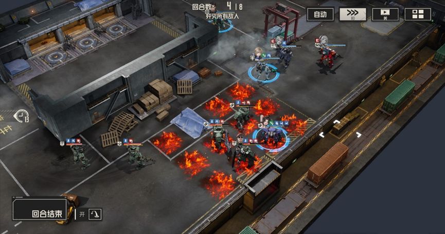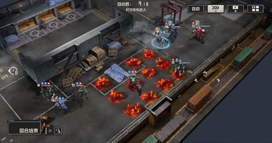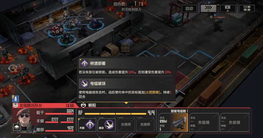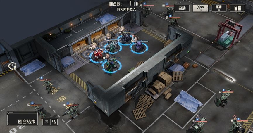 本关难点:本关buff实际上是对敌人的一个补充说明,敌人每回合都会进入隐身状态,使得敌人无法被选中,通常情况下,隐身状态下攻击会解除隐身状态,但在本关的buff加持下,敌人即使主动攻击也能保持隐身状态,如果缺少破除隐身状态的手段,那么我们就会额外浪费机师的行动机会。此外本关中的电磁炮敌人威胁较大,会导致我们无法被维修和使用技能,需要优先处理