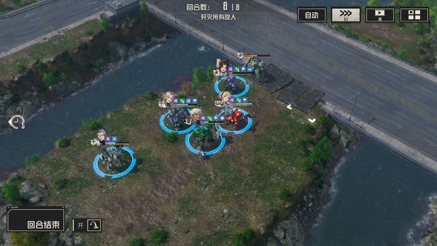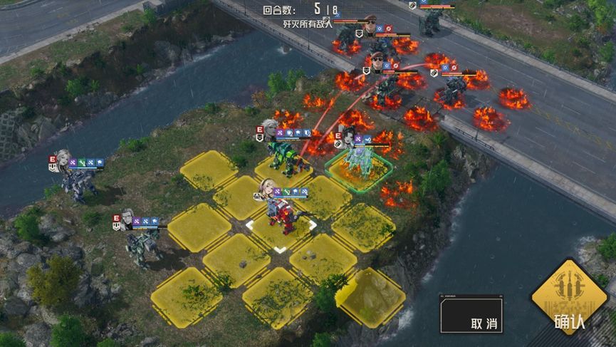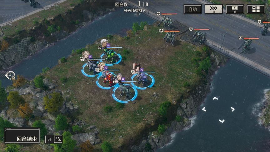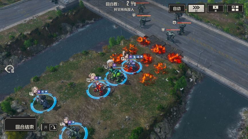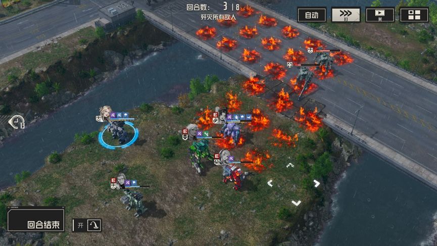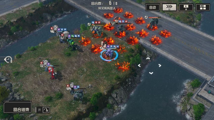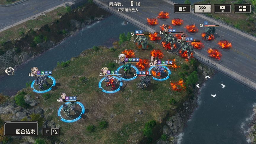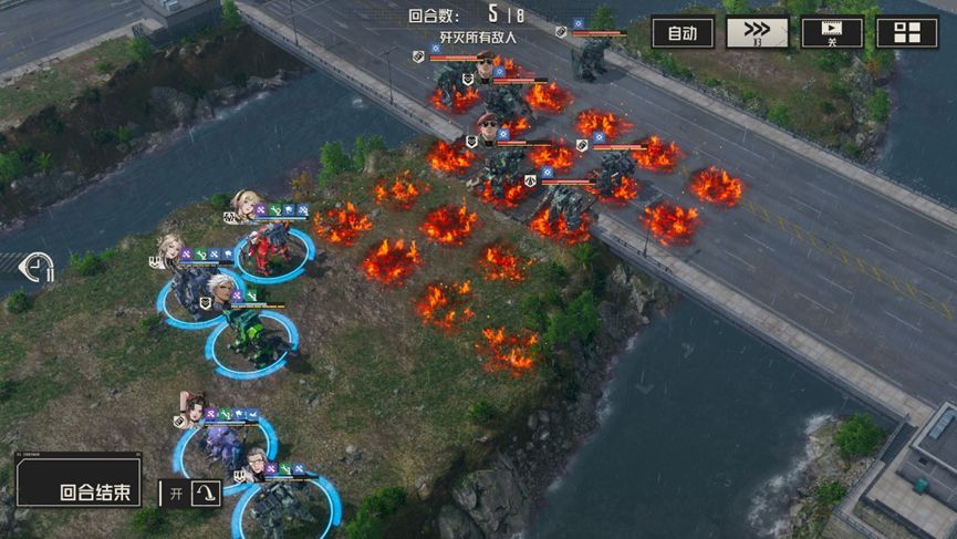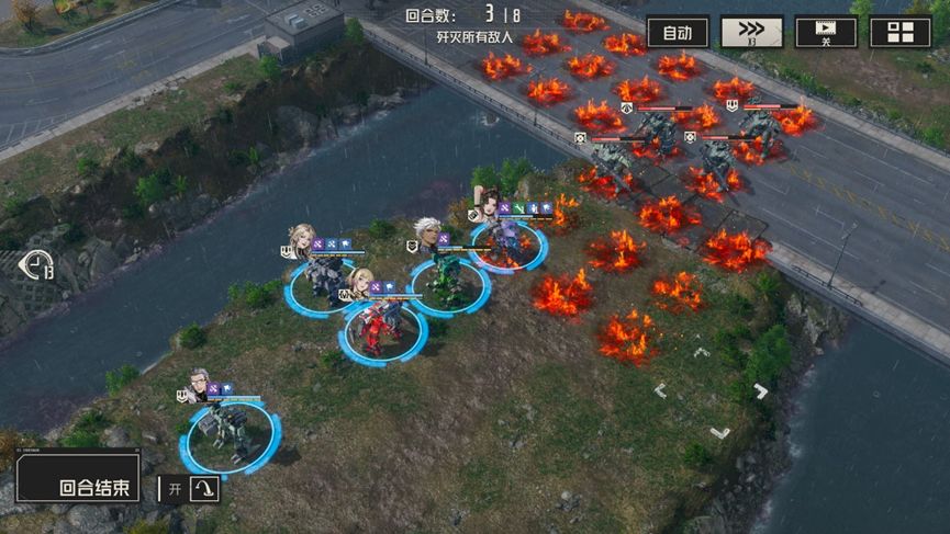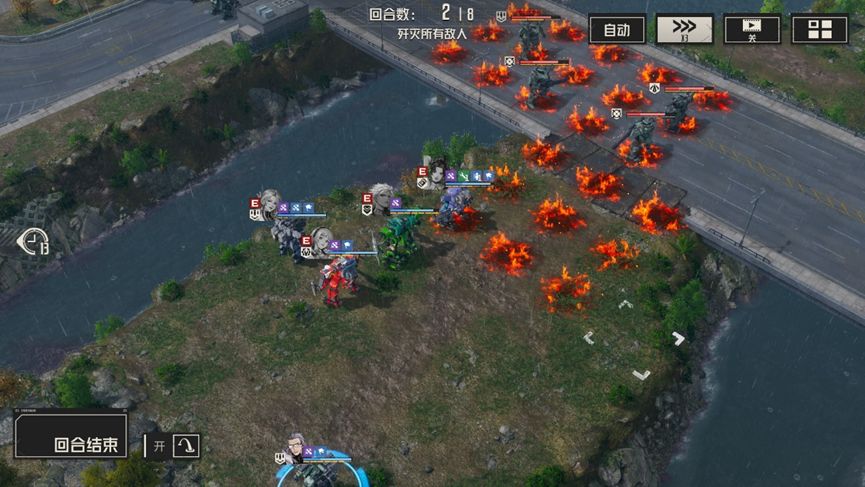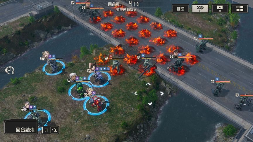 本关解法:多次行动会加快buff叠加,显然应当减少行动次数,并让单次行动伤害最大化,因此火箭战术家在本关有非常重要的作用,尤其是能创造燃烧地形的艾琳,另外西塞罗由于自身能够恢复耐久值,减少治疗压力,在本关也有也有不错的发挥。通过观察可以发现,开局我方处于地图左边,两面环水,只有前方受敌,可以采取原地防守的方式进行作战,尽量不主动出击,先aoe消耗敌人血量,能够补刀一次攻击消灭敌人时再出击,将敌人消灭。这样一方面可以让我方在buff叠满触发后,及时撤离到安全位置,保证安全,另一方面减少主动攻击次数,也可以减少受到buff的伤害。本关最好上阵一个守护者,因为我方输出受到buff伤害后,血量较低的情况下容易被敌人消灭,守护者正好能保护好他们。