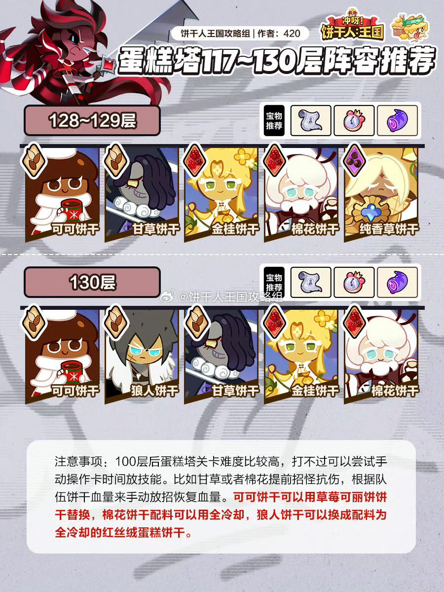 蛋糕塔117~130层阵容推荐,100层后蛋糕塔关卡难度比较高,打不过可以尝试手动操作卡时间放技能。可可饼干可以用草莓可丽饼饼干替换,棉花饼干配料可以用全冷却,狼人饼干可以换成配料为全冷却的红丝绒蛋糕饼干。