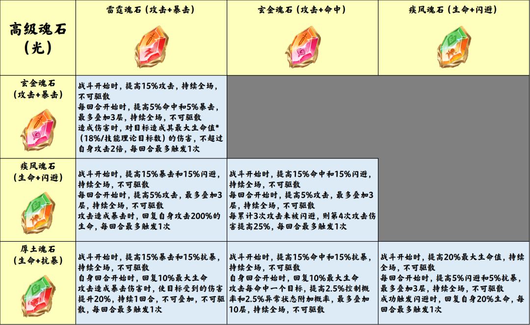 高级魂石分为“玄金”、“雷霆”、“疾风”、“厚土”四个种类,均为双属性魂石。不仅自身提供的属性非常高,同时两两组合还能产生技能效果。升到5星之后可以使用兽心淬炼成光暗魂石,并大幅强化技能效果。
