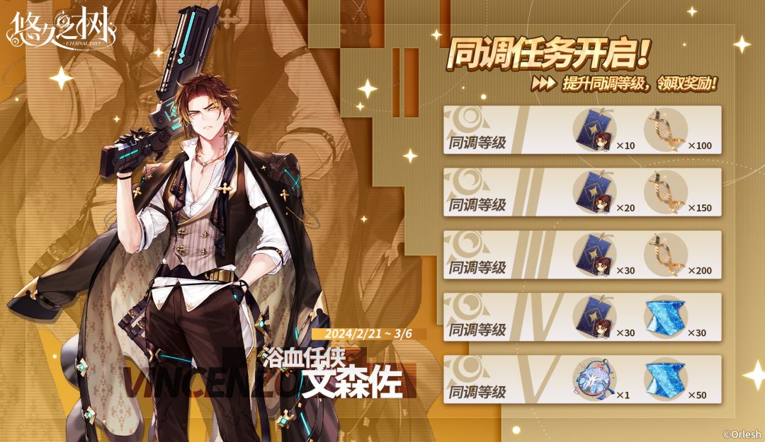 活动期间,提升新角色「浴血任侠·文森佐」的同调等级,即可获取新角色的许愿签等道具奖励!
