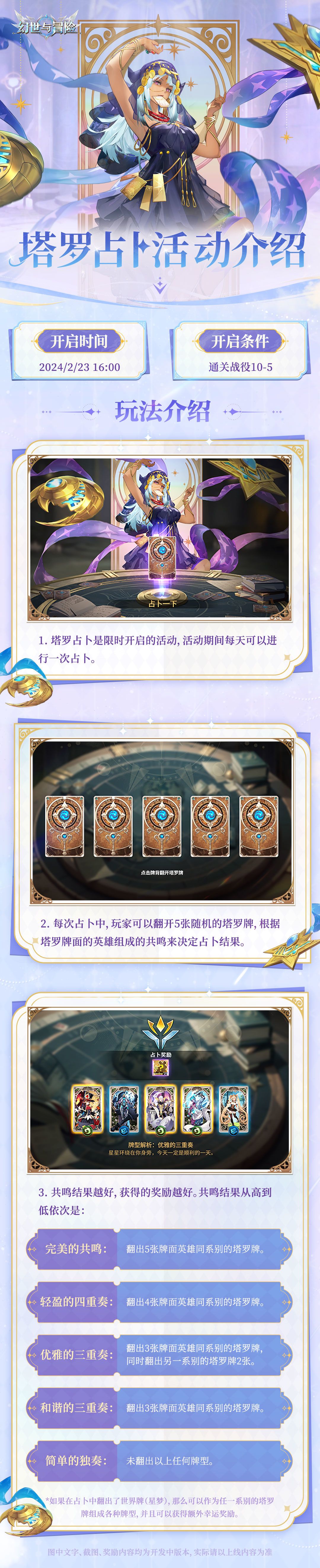 塔罗占卜活动将在2月23日开启!活动期间,指挥官每日参与占卜,根据不同的共鸣结果,即可获得丰厚奖励~