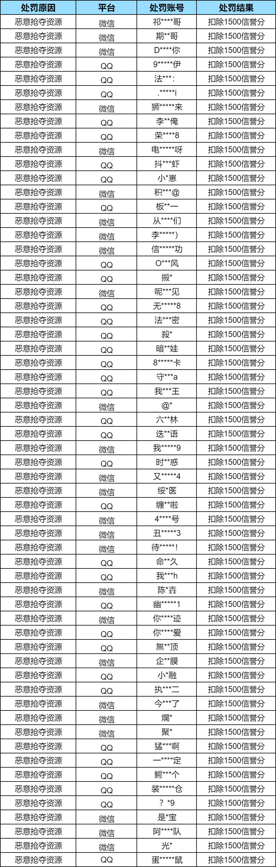 2月12日-2月18日期间,共处罚6752个作弊账号,以下为部分账号公示: