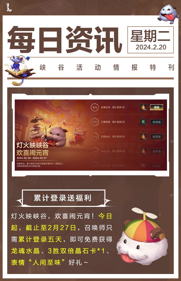 猜灯谜,品汤圆,元宵佳节共团圆!今日起,截止至2月27日,召唤师只需累计登录五天,即可免费获得龙魂水晶、3胜双倍晶石卡*1、表情“人间至味”好礼~