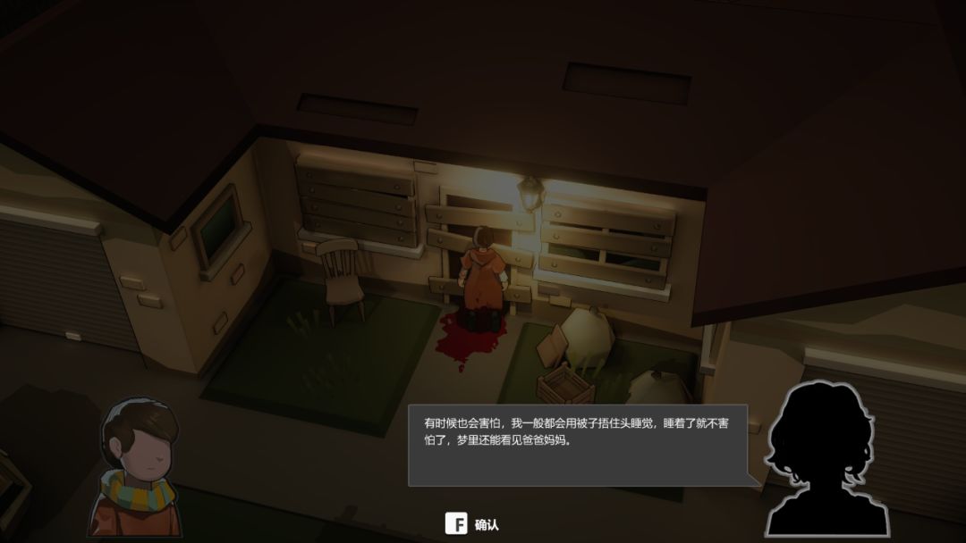 不过,这样的欺骗并不是出于纯粹的恶意,这对胆小夫妇的争吵琐碎又毫无意义,两个声音在一片焦躁中指责,叽叽喳喳,像两只饥饿的麻雀。与其说他们坏,不如说是可怜。父亲不敢出门,母亲埋汰他胆小如鼠,父亲回嘴,你就跟我吵吧,吵到大声疾呼,吵到丧尸包围,把闯进屋子把我们吃掉才好……而他们的女儿就在一片抱怨声中,沉默地听着,然后在父母的怂恿下向玩家索求食物。