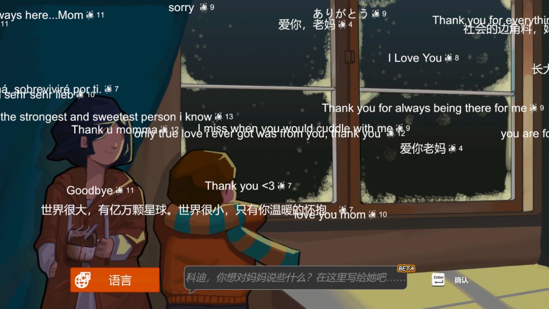 出乎他的意料,这个并不谨慎的想法得到了团队的一致认可,然后便是急忙的齐心协力。游戏上线那天,新功能如期展示在了每一个玩家开始游戏前能看见的地方。这是一个单独的页面,密集记录了许多真切的话,背景是科迪和母亲的插画,文字像视频弹幕那样自右向左滑动。所有的话都是玩家手动写下的,再由制作团队人工审核,一条又一条: