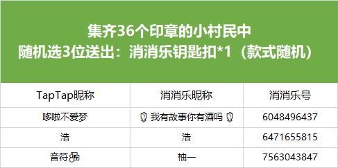 ■集齐36个印章的小村民中,随机选3位送出:消消乐钥匙扣*1(款式随机)