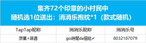 ■集齐72个印章的小村民中,随机选1位送出:消消乐抱枕*1(款式随机)