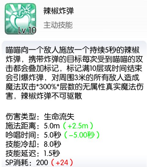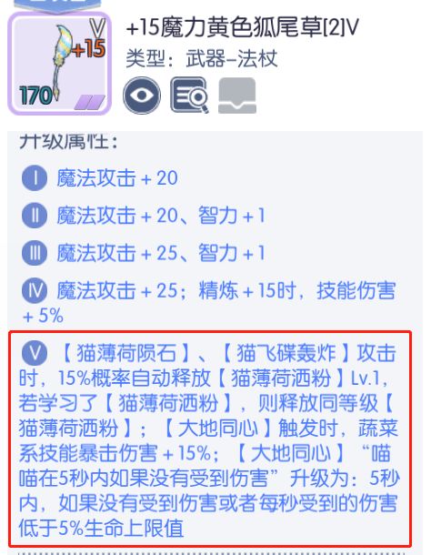 武器5阶效果,可以自动降速度和攻击,法猫在pvp和pve的时候,尽量不要被人或者怪打到,因为5秒内如果没有受到伤害,法猫的伤害是最高的。