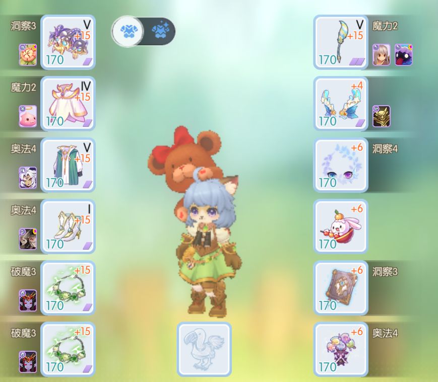 衣服卡和头饰卡要随机应变,遇到刺客就换凯美拉卡,法猫还是跟其他法系一样的,也是吃法暴,所以右边装备大同小异。因为我饰品有两张灾厄魔女卡,所以头部就可以换成技能头了。