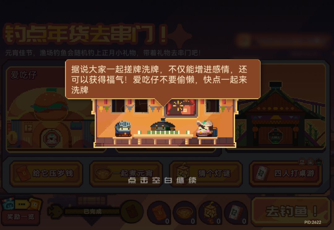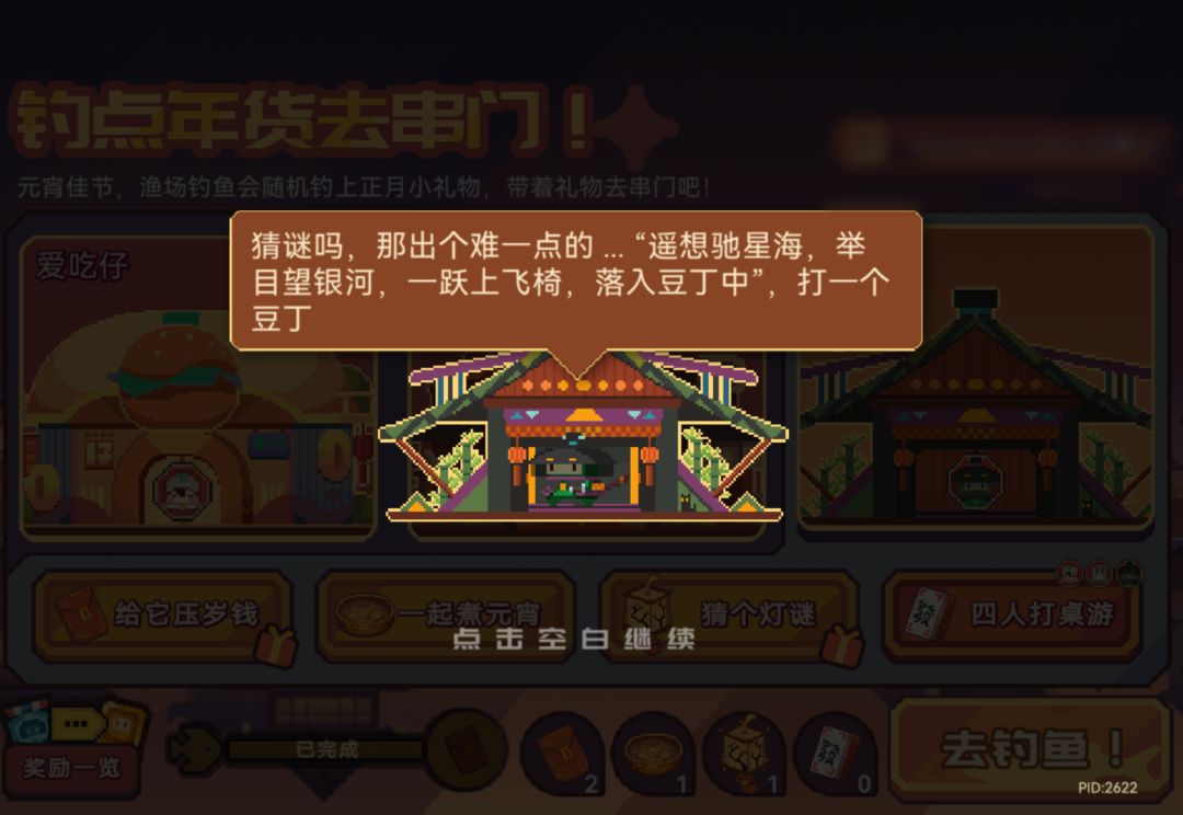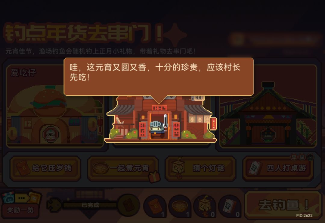 活动期间,每完成若干次钓鱼可以得到一份串门伴手礼(红包、汤圆、花灯、桌游),钓上来的福气当然要送到村里啦!豆丁在家的话可以带着这些伴手礼热闹热闹!