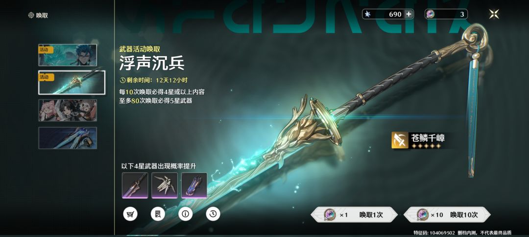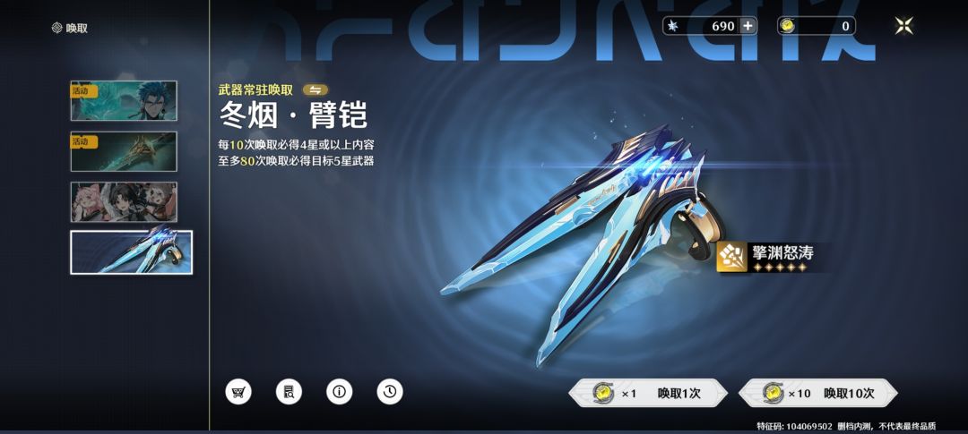 本卡池每10抽必出一个4星武器/4星角色,若抽出5星内容必为5星武器。