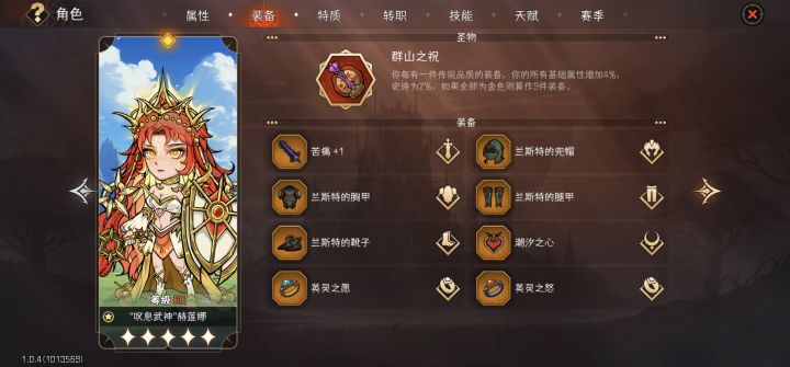 首先我们抽出帝国剑圣,阵容为光牧或者光骑加血,霜狼勇士打控制,在随便搭配一个副c杜鹃,没有就用火法可以用绿打单体boss的工具人。优先升星剑圣,圣物如果有兰斯特套装就选群山,可以极大的提高剑圣输出,让她做到一人c全场,打boss也是主力输出。如果没有一整套兰斯特,就用帝国圣物搭配乌拉尔和兰斯特。项链潮汐之心加技能范围,戒指减蓝减cd,有一套这样的3阶套装,搭配这个阵容,剑圣可以自动用极快的速度帮你打到41难,效率比让火法和杜鹃主c吃资源快的多,到了41难再补强其他人,不挑天神不挑遗物,可以说简单无脑刷图巨快。天赋如图,赛季天赋选点燃,技能顺序是旋风斩,蓄力姿态,战吼。我这个剑圣是0命5星,现在打60难的图也巨快,就是打不动精英挑战的bosss。
