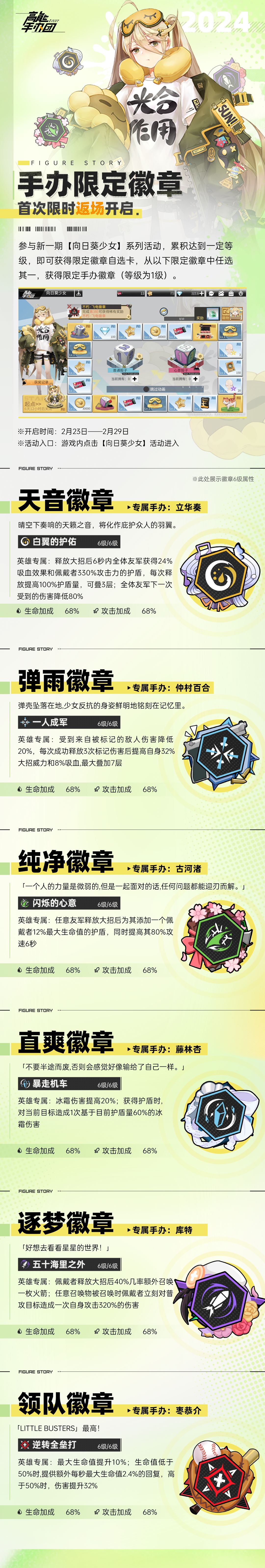 参与新一期【向日葵少女】系列活动,累积达到一定等级,即可获得限定徽章自选卡,从以下限定徽章中任选其一,获得限定手办徽章。