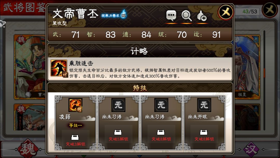先来看看文帝曹丕的整体属性界面: