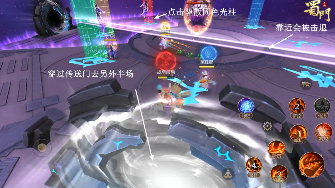应对方法:召唤的光柱必定包括四种颜色,大家各自寻找符合自己『四象印记』光柱点击驱散即可。记得使用加速技能!如有颜色BUFF缺失,则使用『标记』技能,重新调整自己的『四象印记』后进行驱散。在血魔血量低于80%以下时,中间的光柱墙无法穿越,可以借助传送门穿越。