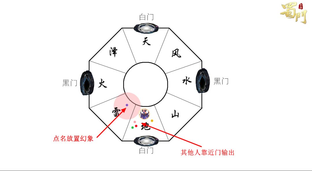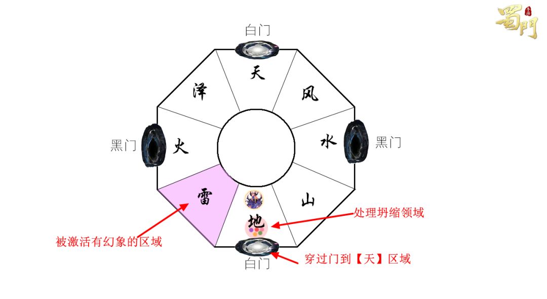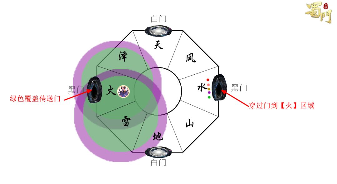 2、场边上的门。在天地两个字边分别有两个白门,在水火两个字边分别有两个黑门,同色门互相对位。进入场地一侧的传送门,可传送至其场地对面的同色传送门处。