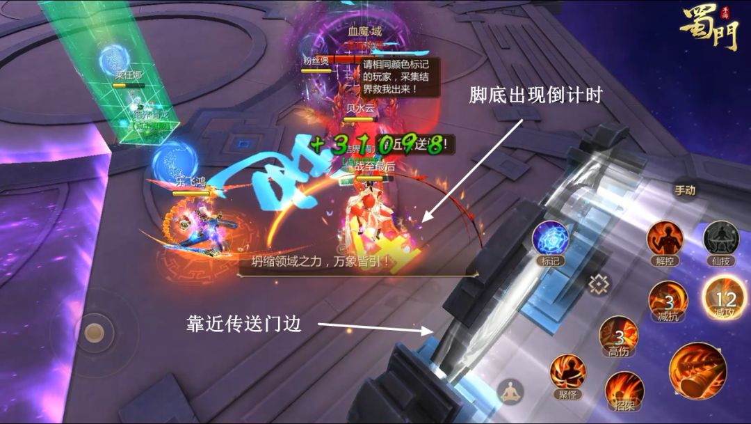 4、BOSS释放禁闭领域技能,会有明显的紫色落雷落下,此时所有成员立即通过【火】区域的传送门传送至对面【水】区域。