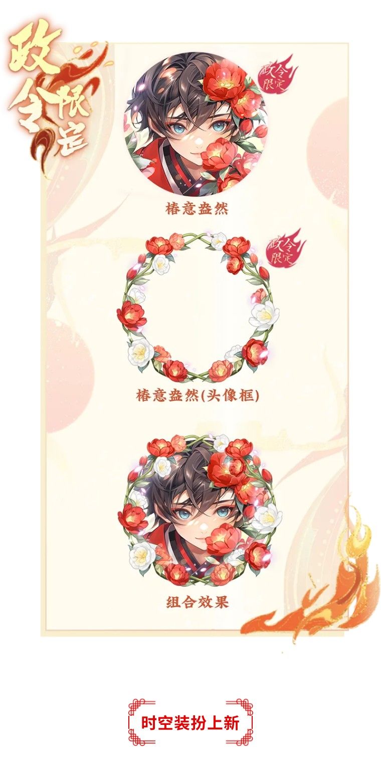 新的一期上凰政令将于2月26日00:00至3月24日23:59开启,提升政令等级,购买进阶方案,有机会获得全新头像/头像框/气泡框“椿意盎然”