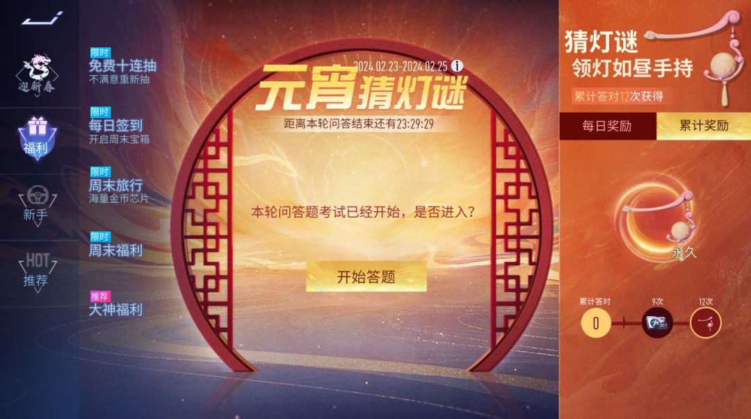 元宵灯会,谜语扬帆!2月23日~2月25日,车手们在飙车之余别忘了来参加“元宵猜灯谜”的限时活动,每日10道灯谜挑战,答对其中6题即可领取金币奖励。累计猜对12题还可以免费获得全新手持-灯如昼~