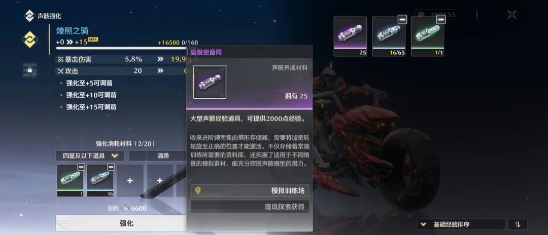 养成材料为【密音筒】,材料分为三档,分别提供不同的数量的经验,获取方式为大世界探索(宝箱)、任务、体力副本(模拟训练场),后续版本活动应该也会产出。调谐需要消耗【调谐器】,不同级别的调谐器只能调谐对应星级的声骸,获取方式同上。