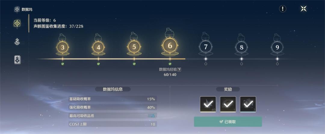 通过收集声骸,能够逐步提高数据坞等级,数据坞等级越高,吸收声骸的概率和品质越高。数据坞提供了声骸的图鉴和套装信息,便于玩家收集和配队。目前数据坞开放等级为20级,此外,数据坞升级还会提供提高角色耐力值上限的道具。目前声骸图鉴已经有228种声骸,数量相当可观。