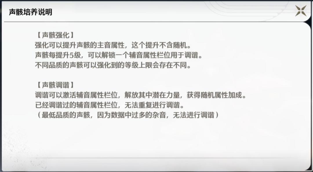 声骸每提升5级,可以解锁一个辅音属性栏位用于【调谐】(需要使用特定道具调谐器)。不同品质的声骸可以强化到的等级上限会存在不同。最高品质的声骸最高提升为+25,意味着有五个副词条,副词条的刷新是随机的,副词条内不会重复出现。