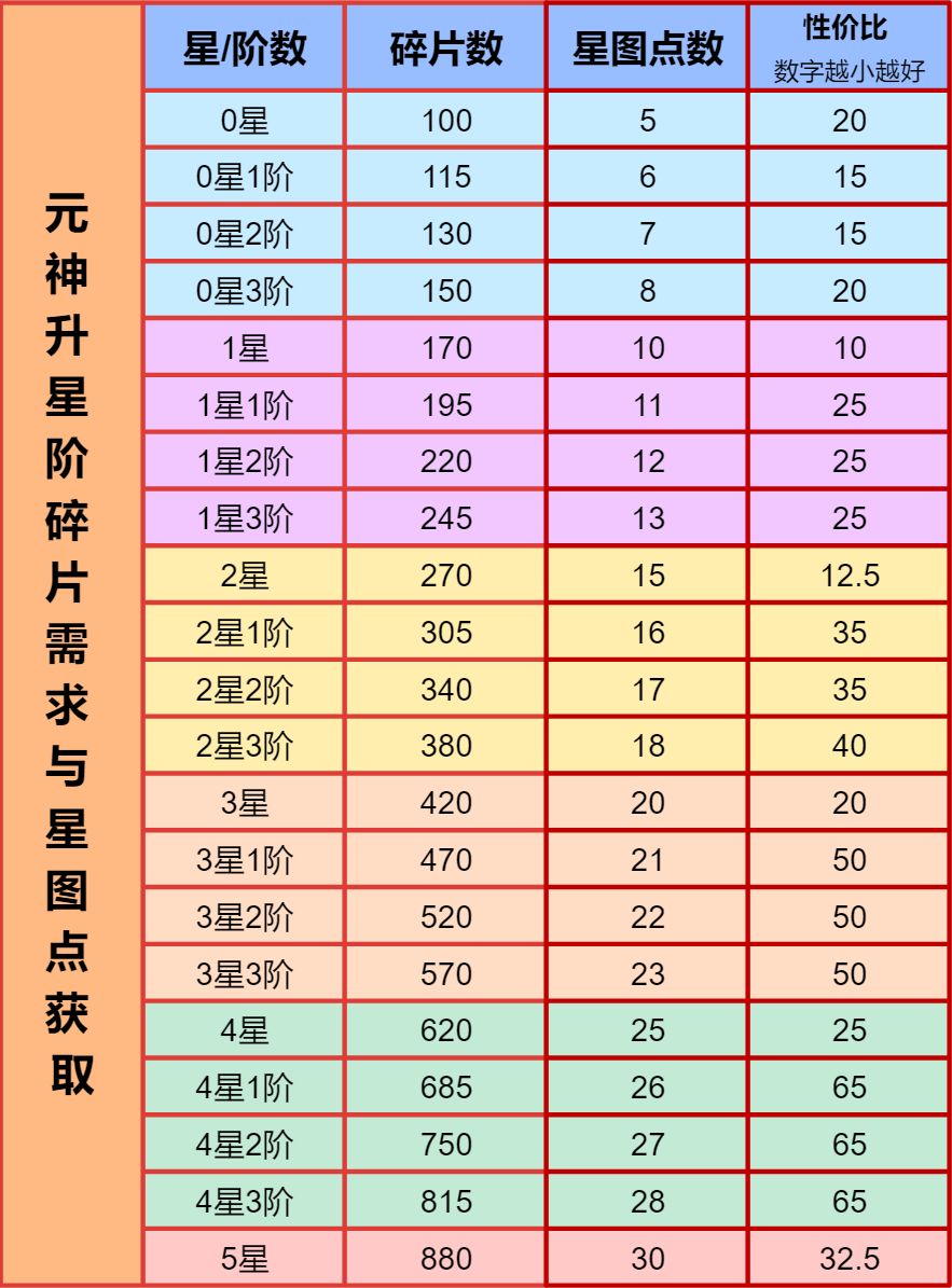 注:星图才是赤魇/金霄元神的重点,升星属性对比星图的技能+属性不值一提,同样的碎片,多个低星元神获得的星图点数远超单个高星元神,所以优先开6个低星元神。