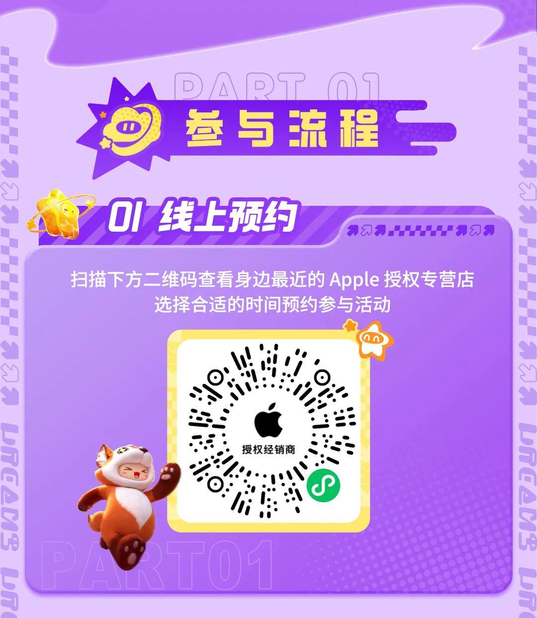 到访授权专营门店,一起元梦开心派对。活动期间,扫码预约身边最近 Apple 授权专营店,签到即可获得道具礼包,完成任务还有机会获得精美周边;