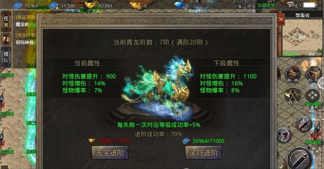 青龙、白虎、朱雀、玄武满进阶的成功率为 70%,白虎进阶的概率为 45%,明显低于青龙,而且花费的元宝灵符也较多。