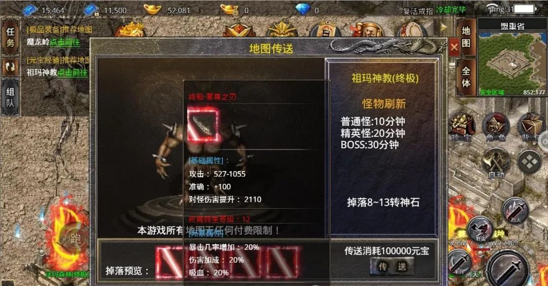 前期的话,我会建议大家去祖玛神教这个地图,老司机亲自试过,爆率颇有惊喜,很大几率会爆出八到十三转的装备以及材料,甚至终极装备,如果幸运地打到一件终极装备,就可以直接起飞了!不过在这里我要提醒大家,虽然爆率高,但是也要确保自身实力足够强大,以免出现偷鸡不成蚀把米的情况,被直接送回城了哦。