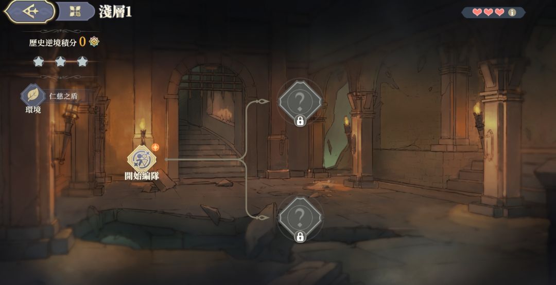 - 浅层1:仁慈之盾-结束行动时,若本次行动没造成伤害,获得10%生命值的[物理护盾],持续1回合。拥有[护盾]时,造成伤害提高20%。