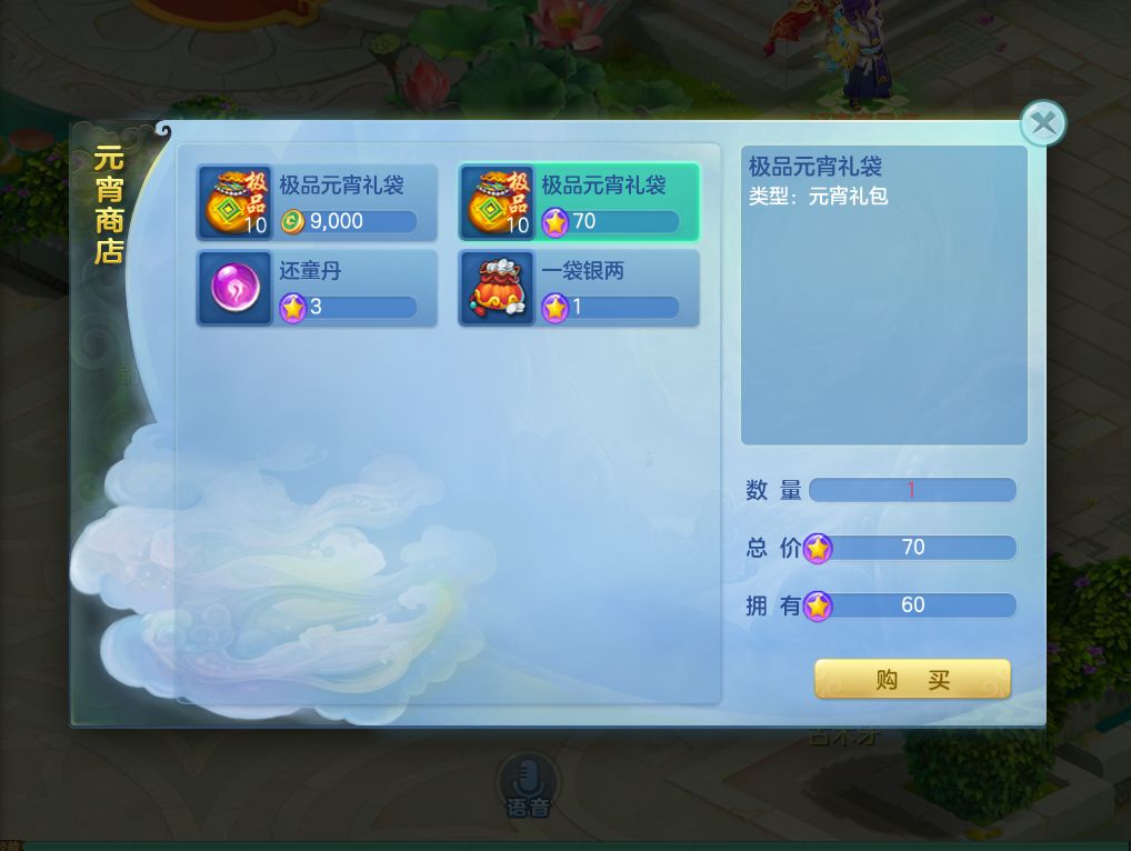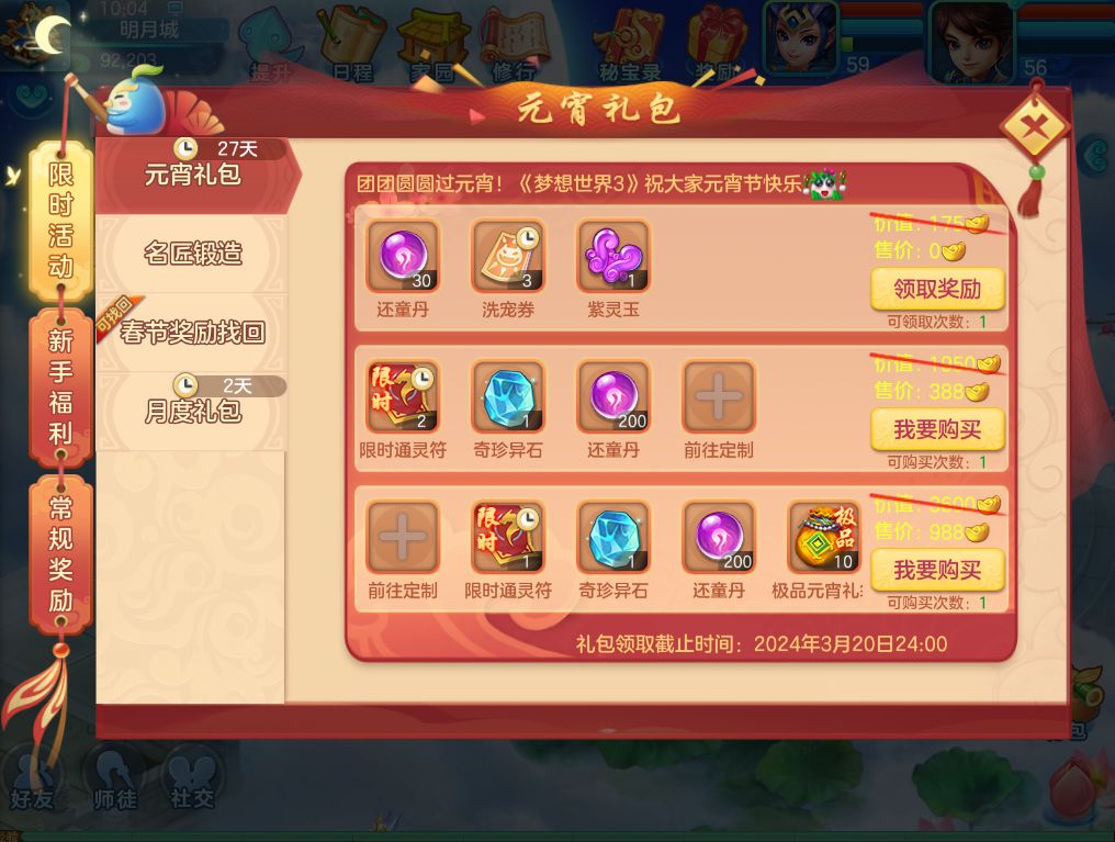 2月22日10:00至3月6日24:00,可前往元宵使者处使用元宵积分、梦想币购买极品元宵礼袋。