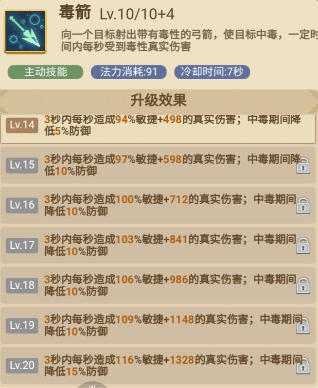 毒箭射出毒箭头对单个敌人造成3秒中毒效果高等级可减防