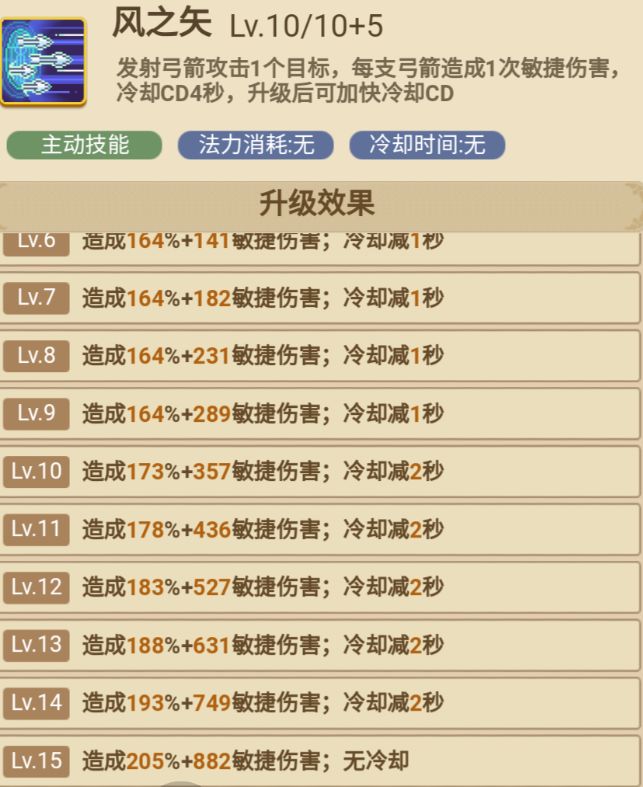 风之予是弓箭手必备技能达到15级后可以无cd释放代替普攻