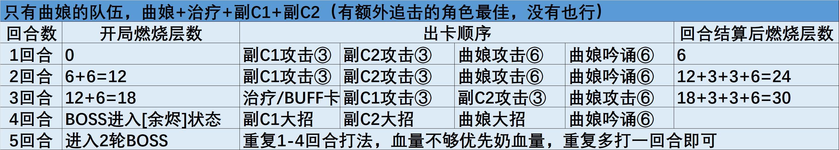 (伤害够可直接秒掉1轮BOSS进入2轮,不够就继续4回合打输出卡秒掉1轮BOSS进入2轮,曲娘2技能卡留4号位释放)