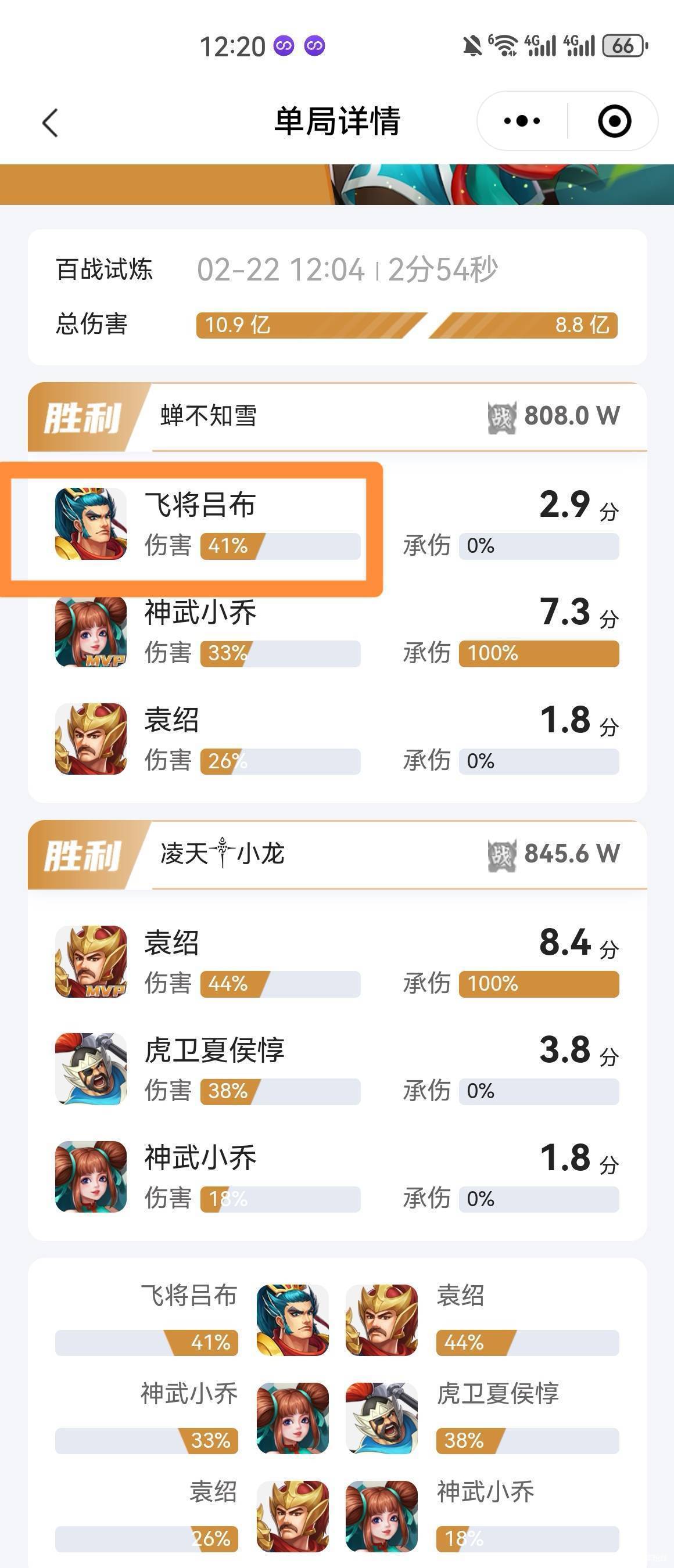 百战45层,上飞将吕布,小乔,袁绍,伤害输出图。
