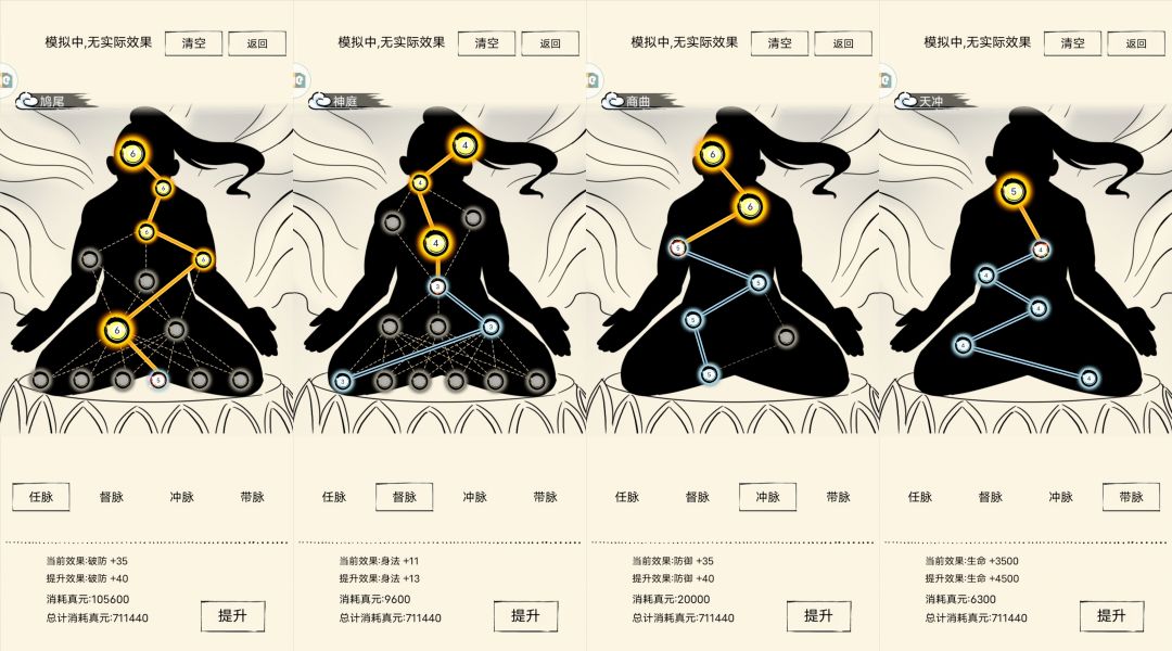 在这里提醒各位萌新:虽然有一两百万轮回的大佬,但一般最终4轮前,70~80万真元就已经是佬中之佬了,所以萌新们不要好高骛远,别对七级以上的经脉有太大的想法。