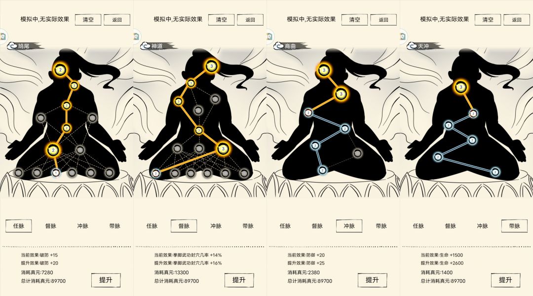 兵械类玩家:任脉加点通常选择x.5(x为任脉大等级),也就是将任脉小等级点到生命、攻击、命中、四维和破防,因为第六个小等级只加一系数5%的伤害,却是所有小等级中最贵的,是性价比最低的(当然,任脉加点也可以选择x.1,因为生命脉是性价比最高的,可以抵消一下性价比最低的系数脉,也就是将任脉小等级点到生命即可。)督脉加点则需维持x.3(x为督脉大等级),也就是将督脉小等级点到生命、内力和四维。