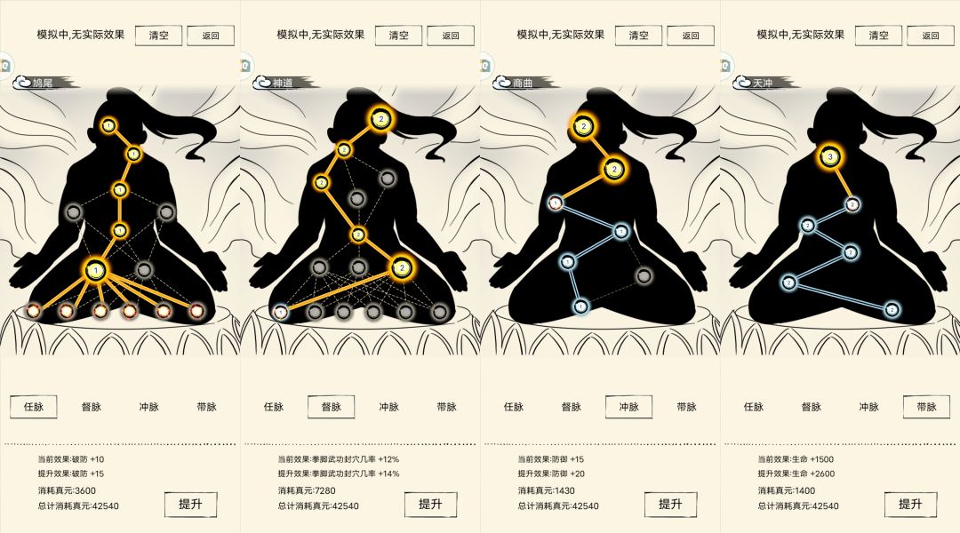 为了统一性,兵械类玩家经脉加点,暂时统一以主刀系数作为样例,后文有详细的各类型武学的经脉加点攻略。