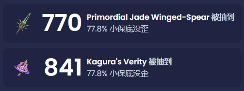 在武器池方面,可以看到抽取数据也是惨不忍睹。和璞鸢和神乐之真意的出金都只有三位数,而且比例也很接近,总体符合武器池的出金比例。