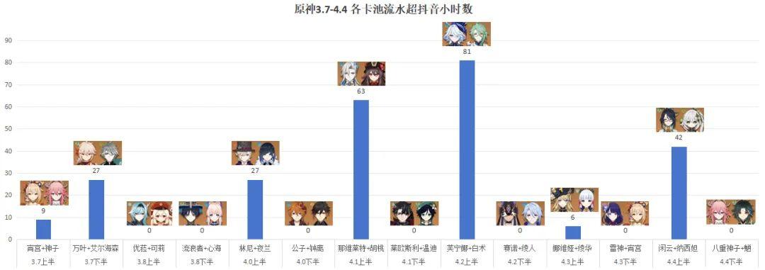 从图中不难看出,本期的4.4下半的魈&八重神子卡池超抖音0小时,也意味着本期卡池的流水表现属于“查无此人”。并且同样是超抖音0小时的卡池之间也有不同,有的相对高一点,有的还要更低。但无论如何,本期卡池相对来说是一个表现不佳的卡池。