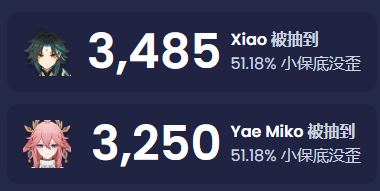 再来看看paimon.moe统计的魈和八重神子的出金数量比例: