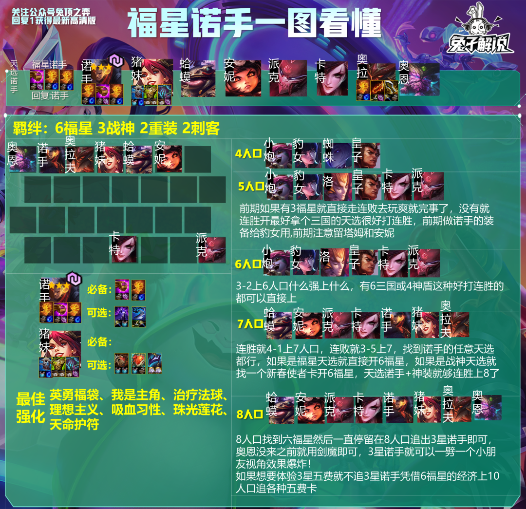 这套阵容就是之前S4.5时的赌诺手,我是之前玩了不少,然后这几天测试过后发现还是很能玩,特别是诺手3星后一个打十个的场面非常快乐,6福星虽然被削弱后,掉妮蔻概率变得非常低,但提供的大量经济如果想追3星五费还是能追出来的,如果大家玩福星赛季时胡诺手可以玩!